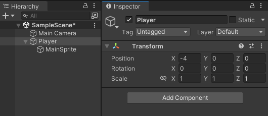 부모인 Transform의 Position값을 바꾸면 자식인 MainSprite의 값도 따라온다. 부모의 절대 위치(World Position)가 기준이 되어 자식의 상대 위치(Local Position)가 절대 위치와 달라질 수 있는 것이다.