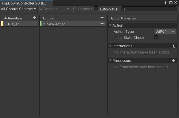 추가한 컨트롤러를 열고 Add Control Scheme에서 +를 눌러 키보드와 마우스를 생성한다.