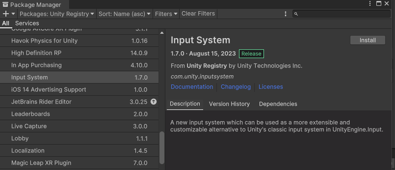 이제 플레이어의 Input을 처리할 수 있도록 만들어주기 위해 유니티에 Input System을 추가적으로 설치 해준다. Input System은 조이스틱이나 다른 컨트롤러 등까지 호환되기 때문에 자주 사용된다.