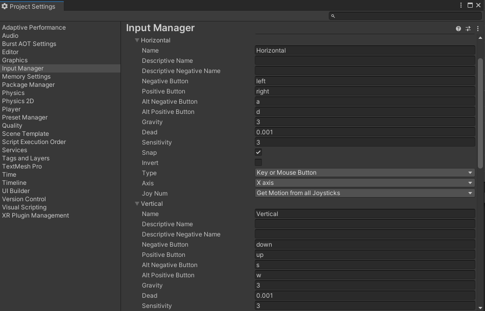 Edit - Project Settings - Input Manager에서 보면 "Horizontal"은 Left와 Right를, "Verticla"은 Down와 Up 방향을 자동으로 처리해준다. 즉, Axis(축) 값을 가지고 왼쪽, 오른쪽, 위, 아래 라는 값을 반환 받고 있는 것이다.