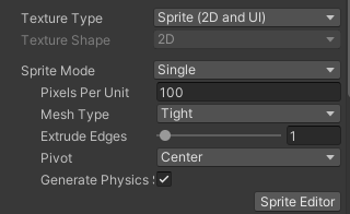 PPU값이 100이라는 의미는 Unity의 단위인 1유닛 안에 100 픽셀이 들어간다는 뜻이다. 즉, PPU값이 작을수록 1유닛 안에 차지하는 픽셀수가 줄어들기 때문에 이미지가 픽셀화 되며 커진다. PPU값은 이미지들끼리 통일해주는 것이 좋으며 높아질수록 고해상도가 되어 성능에도 영향을 미치기 때문에 값을 고려해야한다.