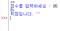 score = int(input("점수를 입력하세요 : ")) if score >= 95 : print("A+") elif score >= 90 : print("A") elif score >= 85 : print("B+") elif score >= 80 : print("B") elif score >= 70 : print("C+") elif score >= 75 : print("C") elif score >= 65 : print("D+") elif score >= 60 : print("D") else : print("F") print("학점입니다. ^^")