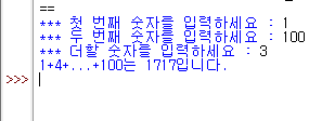 5-2 [프로그램 2]의 두 번째 기능처럼 두 숫자를 입력받고 두 숫자 사이의 합계를 구하는 프로그램을 만들어 보자. 단 1씩 증가하지 않고 증가하는 숫자도 입력받는다. 예를 들어 1, 100, 3을 입력하면 1+4+...+100의 합계를 구한다.
