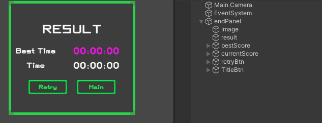 종료 화면의 내용은 버틴 시간과 다시하기, 메인으로 가는 버튼으로 구성되어있다. 일단 껍데기를 만들어준다.
