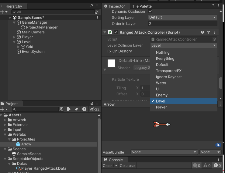 그리고 투사체 Prefab을 컨트롤 하는 스크립트에서 레이어를 Level로 바꿔준다.