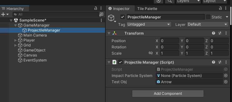 투사체에 투사체를 컨트롤하는 스크립트를 달아주고 GameManager를 만들어 매니저 스크립트를 달아준다.