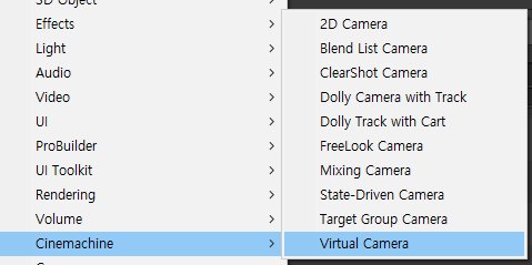 하이어라키에 우클릭하여 Virture Camera를 추가한다.