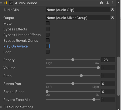 노트가 나오면 음악이 나오도록 임시로 오디오 소스를 넣는다. 자동으로 재생하지 않도록 Play On Awake를 꺼준다.