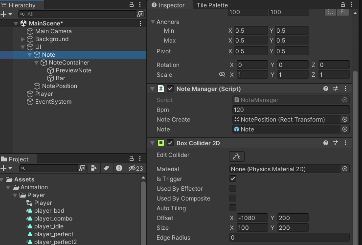 노트의 충돌을 감지하기 위해 Rigidbody와 Collider를 붙여준다.