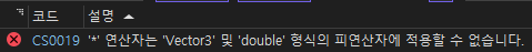 float에 비해 double의 소수점 범위가 더 크기 때문에 발생하는 문제가 아닐까 예측했는데 double의 연산자 오버로딩이 없어서 그런 것이었다. 즉, 유니티에서 Vector3에 곱하는 방법을 명시하지 않은 것이다.