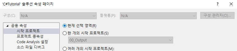 솔루션 우클릭 > 속성 > 공용 속성 > 시작 프로젝트 > 현재 선택 영역