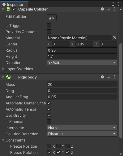 플레이어에 Capsule Colider와 Rigidbody를 달아준다. Rigidbody의 질량(Mass)는 20 정도로 너무 가볍지 않게 주고 Freeze Rotation의 X, Y, Z축을 물리적인 회전을 하지 않게 켜준다.