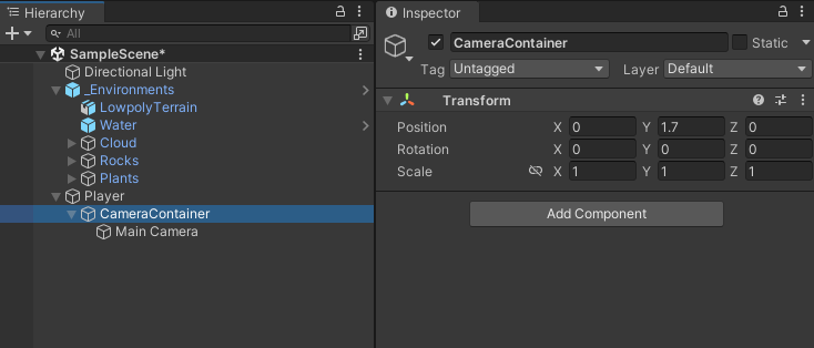 기본 오브젝트를 생성하여 플레이어를 만들고 하위에 눈(시야) 역할을 할 오브젝트를 추가한다. Main Camera를 하위에 넣어 좌표를 플레이어에게 고정시킨다.