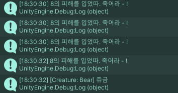 Debug.Log($"{hitInfo.Damage}의 피해를 입었따. 죽어라 - !");