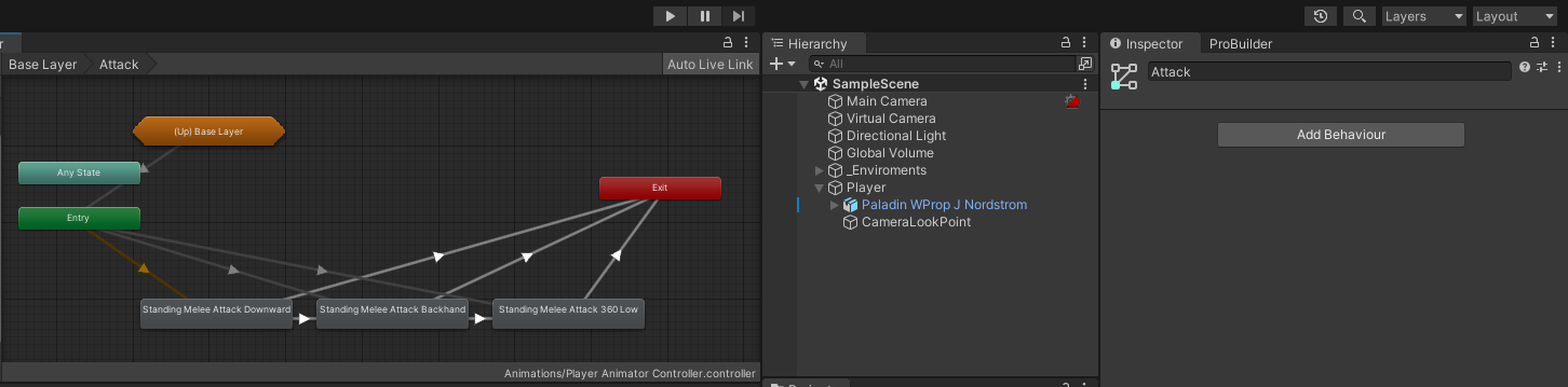 마찬가지로 플레이어의 기본 상태 스크립트에 공격에 대한 입력값에 대한 코드를 추가한다.