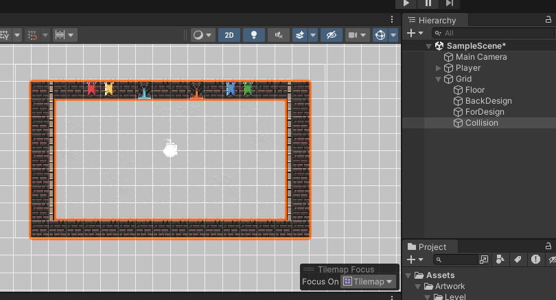 적당히 꾸며주고 Collision을 따로 만들어 Tilemap Collider 2D를 추가해준 후, 충돌범위를 지정해주고 투명도를 조절해서 보이지 않게 해준다.